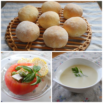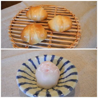 4月 バターロール イチゴ大福 春キャベツと塩麹鳥のサラダ 若竹とハムの塩麹スープ