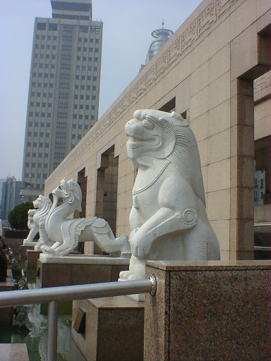 上海博物館。大きくて、中は綺麗でした☆ 左は水を入れて揺らして遊んだというもの。中に魚や水鳥がいるのです。風流やねぇ。 変わった形の建物。右の奥の方見て。ビルの上にUFOがのっかってるみたい。 豫園内。やはり龍好き 足つぼ効果! やたら得意げなお兄さん。すごい勢いでお湯が出る! 人・人・人・・・活気にあふれる老街