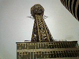 ナンでも街の北半分をパリ、南半分はニューヨークを模した大歓楽地として構想され、開発の象徴が今や大阪のシンボル=通天閣です。現在の通天閣は内藤多仲氏の手による二代目。上部はエッフェル塔を、下部は凱旋門を同時にパクったデザイン(笑)昔はどんな広告が掛けられていたのか知る由もありませんが、現在は『日立ITソリューション』と、ここにもIT革命の波が押し寄せていました(笑)