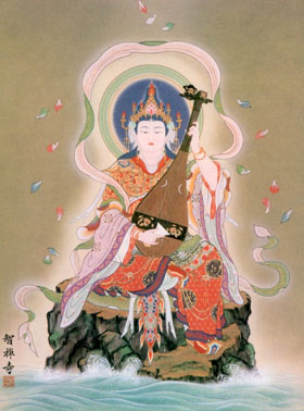 弁天様は天部と言われる仏教の守護神達の一神で、 もともとはヒンドゥー教の女神であるサラスヴァティーが 仏教に取り込まれたものであるとされます。 日本では仏教だけでなく神道の神様でもあります。 サラスヴァティーとはサンスクリットで『聖なる河』という意味を表す言葉で、 本来はインドの川の神様だったそうですが、川の流れる音が あまりにも美しい音色だったために音楽の神様とされ今では福徳や学芸の神様として 幅広い信仰を集めておられます。 真言宗ではロ奄 薩ロ羅娑ロ縛底 卑 莎訶(オン・ソラソバテイ・エイ・ソワカ)と唱えます。 ロ奄と省略せず最初に曩莫 三曼多 没駄喃(ノウマク・サンマンダ・ボダナン) と唱える場合もあります。 |