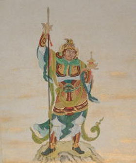 鍾馗様はもともとは道教の神様ですが日本で民俗信仰の対象とされています。 疱瘡除けや学業成就に効があるとされ端午の節句に絵や人形を奉納したりします。 また、鍾馗様の図像は魔よけの効験があるとされていて旗、屏風、掛け軸として 飾ったり、京都では屋根の上に鍾馗様の像を載せたりもします。 鍾馗様は中国に実在したとされる人物で官人になろうと志し科挙に臨みますが 受験に失敗したショックで宮中で自ら命を絶ってしまいます。 それからしばらくして唐の玄宗皇帝が謎の熱病にかかり床に伏せられました。 玄宗皇帝は高熱を出し悪夢にうなされます。その夢の中で、 宮廷内で虚耗と名乗る小鬼が暴れまわって皇帝のお妃である楊貴妃の 繍香袋と玉笛を盗み去ろうとするので玄宗皇帝は困り果てていました。 そこへどこからともなく大鬼が現れて小鬼を難なく捕らえて食べてしまいました。 玄宗皇帝が大鬼に正体を尋ねると 「自分は終南県出身の鍾馗である。武徳年間に官吏になるため科挙を受験したが 落第しそのことを恥じて宮中で自殺した。だが時の高祖皇帝は自分を手厚く 葬ってくれたのでその恩に報いるためにやってきた」と告げたそうです。 夢から覚めた玄宗皇帝は、自分の病気が治っていることに気付きます。 感じ入った玄宗皇帝は著名な画家の呉道玄に命じ鍾馗様の絵姿を 描かせました。その絵はなんと玄宗皇帝が夢で見たそのままの姿だったのです。 玄宗皇帝は鍾馗様の絵姿には邪気を祓う効力があるとし世の中に広めさせたそうです。 法華宗の神様ではありませんが円常院さんにもお祀りされています。 |