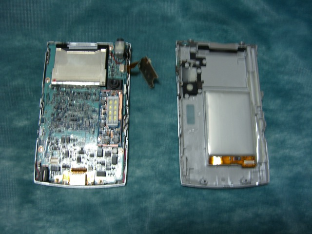 液晶画面左側のスクロールボタンは内部で繋がっています。 右下の右端ボタンのあたりでバッテリーコネクターが繋がっていますので注意しながら外します。 ![]() バッテリーは弱い両面テープで固定されていました。