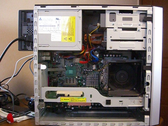 載せ替えはPC本体の後ろのネジ2本を緩めサイドカバーをはずし、DVD固定ネジを2本はずし、 正面化粧版の爪を3本手前に引けば、正面かDVDドライブを引き出せるのでSATAケーブルと 電源ケーブルをはずせば画像右上のドライブを簡単に交換できます。 ![]() |