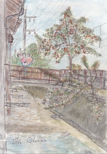 | 明けましておめでとうございます 午 禊川取水口段々の流れと孫を描きました 西新道橋の柿と嵐電を描きました |