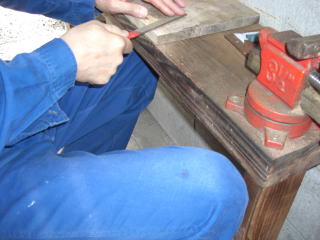 マチガネを作業の板の切込みに埋め込んでヤスリでクサビ形に削り整形します 画像が小さいので見難いですが