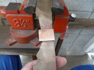 もっと簡単な作り方をします 下図左画像の様な 銅板の切れ端、余り物を用意します ハバキの平地2枚