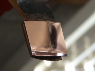 次に金床の上で真っ赤にした銅板を 細く長い叩き面の金槌で 平地の部分を薄く叩き 蝶々の様な