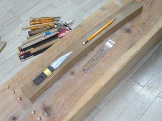 次は八角形にしますので 柄頭に八角形の印しを鉛筆で書きます その後カンナで八角形に削って行きます