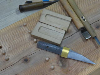 刀身部分を彫刻刀や鑿で厚みの半分位入るまで削ります ハバキ袋は緩からずきつからず