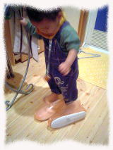 40分ほど売り手をすると、次は売り手と買い手の交代。いよいよのりぽん大好きなお買い物タイム。自分で作ったかばんの中に先生からお金を入れてもらうと欲しいものが売っているお店へ直行!どこへ行くのかと追いかけると電化製品のお店へ。どうやら昨日からビデオを買おうと決めていたみたい。買ったビデオを自慢げに見せてくれた。