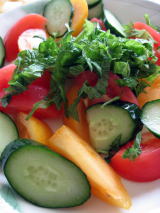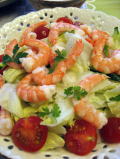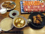 ディナーというほどでもないけど、よしぽんの好きなものを今日は作りましたよ。海老のサラダ・ピザ2種類・牛肉の野菜巻き・コーンスープです。