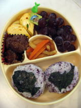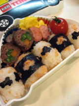 しゃけのおにぎり(ケーキ型)・ウインナー・ミートボール・しいたけのバターソテー・卵焼き・プチトマトです。