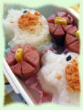パパが胃腸風邪にやられて東京出張をキャンセル。いろいろ朝の予定が狂ってしまい型押しのおにぎりに頼ってしまった。◆ぞうさんの型押しおにぎり(耳を鮭フレークで)、ウインナー(お花風に)、卵焼き(ハート型)、エリンギのベーコン巻き、パイナップル。 |