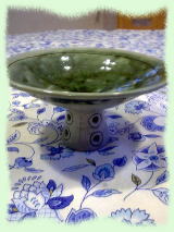 信楽焼の陶器まつりに行って最初に目に着いたのは緑色した高台付の皿です。携帯のデジカメでは少し色がわかりにくいのですが、なんともいい緑色だったので目を引きました。そのあといろいろなテントを見て回ったけど意外と緑色の器ってないんですよね。もっと薄い緑だったりして。一目惚れの器はやっぱり買わなくっちゃ。それと葉型の平皿は安売りのワゴンのなかから発見。安かった(*^_^*)