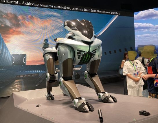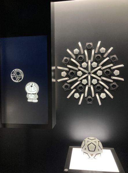 物づくりブースにいたドラえもんと竹のサッカーボール