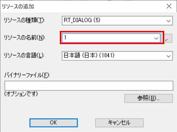 ・「編集」、「追加」、「ダイアログを作成」を選択し、リソース名名称(ここでは「1」)を入れてダイアログを作成する。