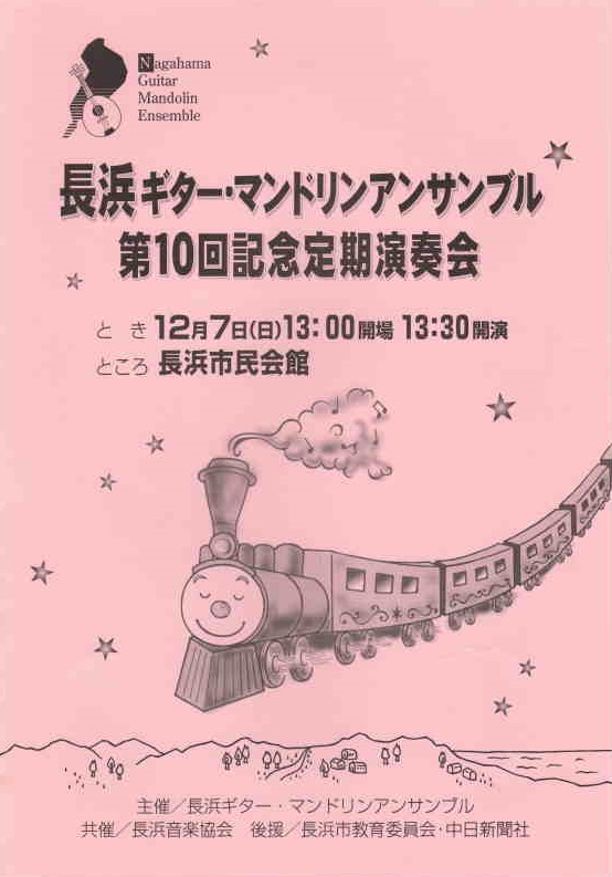 第一ステージ(Original) 指揮:広田 義文 ・ ギリシア風狂詩曲 (N.Lavdas) ・ マンドリンの群 (C.A.Bracco) ・ ニ短調序曲 (S.Falbo) 第二ステージ(なかまとともに) 指揮:木野 眞由美 ・ 翼をください (村井邦彦 arr.山本雅三) ・ 白い恋人たち (フランシス・レイ arr.木野眞由美) ・ クリスマス・イブ (山下達郎 arr.山本雅三) ・ はじめの一歩 (中川ひろたか arr.木野眞由美) ・ 世界中の子どもたちが (中川ひろたか arr.木野眞由美) ・ 風の丘 (久石譲 arr.中川信良) 第三ステージ(楽市楽座) 編曲・指揮:日比 洋 ・ 青春日記 (古賀政男) ・ 誰か故郷を思わざる (古賀政男) ・ 男はつらいよ (山本直純) ・ 御遣り (長浜曳山囃子より) ・ 長浜踊り (吉川静夫) ・ 遠くへ行きたい (中村八大) ・ 丘を越えて (古賀政男) ・ 高原列車は行く (古閑裕而) 第二ステージClassic) 編曲・指揮:日比 洋 ・ 歌劇『セビリアの理髪師』 序曲 (G.Rossini) ・ 喜歌劇『天国と地獄』 序曲 (Offenbach) |
