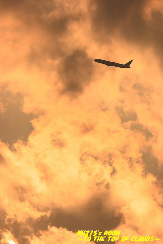 Mar.10.2008 at RWY32Rエンド / Canon EOS Kiss Digital X with EF100-400mm F4.5-5.6L IS USM DATA:SS 1/400 F8.0 ISO100 EV -2/3 Title:炎上の空 Ship:ANA B767-381 JA8569 春の夕刻、沈み始めた夕陽が存在をアピールする様に雲を茜色に染めた。 その空はまるで燃え盛る炎の様に情熱的。 最後の力を振り絞るかの如く空高くまで燃え上がり、1機の出発便を包み込んだ。