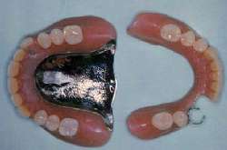 金属床は総義歯によく使われますが、保険外の治療になります。義歯を薄く作れるので、違和感を軽減し、強いこと。熱の伝導がよい事。等が利点です。上アゴの形が変化しにくいので、上の総義歯によく使われます。 欠点は、補修しにくい事で、中途半端に揺れている歯が残っている時は、抜歯してからも使えるような設計の金属床を作るのが、大事になります。 |