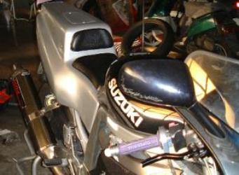| スイングアームに続いてまたもや衝動買いやってしまいました・・・・ でも以前からほしかったTT-F1形状・・・じゃなくて本物(ヨシムラが実際にレースでつかっていた物)のシートだけについつい後先考えずにいってしまいました。 細かいヒビや割れがあるので補修してから再塗装も必要やし、ステーもないし、テールランプも無いし・・・一杯せなあかん事が。 |