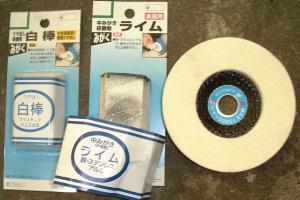 スイングアームにバフをかけたときはハンドドリルにフレキシブルシャフトを付けて作業していたのですが、 あまりに作業効率が悪いので今回はサンダーを使いましたドリルと違い13,000回転ほど出るので早い早い♪ 用意したディスクは金属研磨用の120・240・400番とフエルトバフ&研磨剤(白棒とライム) 初めは120番でさっと一皮(アルマイト)剥きます。あまりヒツコクかけると深いキズが入って後がやっかいになるのでアルマイトがはがれたらそれ以上はしない。 次に240番に変え、120番でかけた時のキズを出来るだけ減らすようにかけますが、これもヒツコクかけない400番も同じ。 |