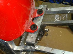 | とりあえずいつものようにフレームに載っけてみると・・・・ なんと取り付け穴の位置がぜんぜん違うでないの。 定番の改造なんでポン付けだとおもってたのに、何をするにもすんなり行きまへんなぁ。 まぁ、フレームが裸状態だから、切ったりはったりがやりやすいからいいか。 | |