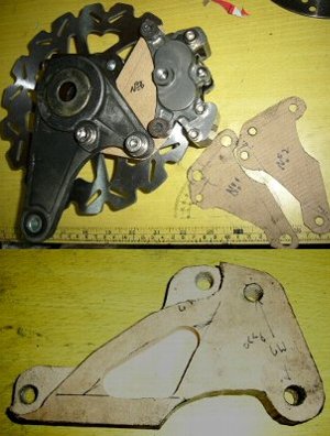 もちろんディスクを替えるとブレーキもそのままじゃ付かんわなぁ。どうせサポートを作るんやったら、ブレーキも替えたれ!ちゅ〜ことでブレンボのカニが余ってるので使おかと思ったが、4ポットにしたかったので、余ってたブレンボレーシングの片側を合わせてみたがサイズがデカすぎて、じぇんじぇん話になりましぇ〜ん!たまたま行った部品交換会で出ていたブレンボレーシングの24mmピストンの4ポットキャリパーも・ど・き(中国製)をゲットしてきたのでそれを使うことにした。 ボール紙で3パターンほど型紙を作りその中で使えそうな型を利用して、木で試作してみた。 | |