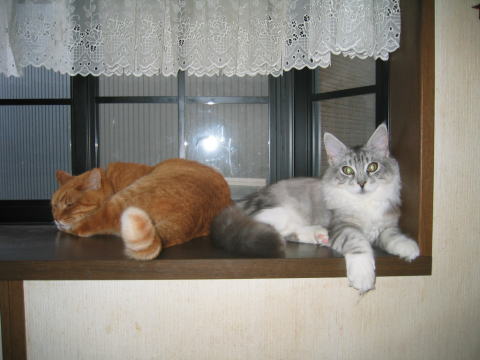 第2弾の近況 左:ノエルさん&到着2日目のクレア嬢 物怖じしない あつかましい(?)子ですv 数日後すっかり仲良しに☆ |