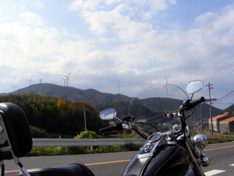 | B南あわじ市までくると前方の山に風力発電用の風車が見えてきます。たくさんの風車が山の尾根沿いに立っています。淡路島は特に冬場は北西の風がきつく吹くところです。「サンセットライン」はところどころ狭くなっていますが全体的には2車線の良い道です。 | ![]() |