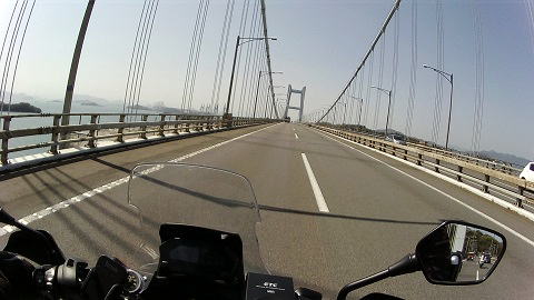 山陽道から瀬戸中央道に入り、瀬戸大橋を渡ります、瀬戸中央道に入ってから、車の量がぐっと減った気がします。今日はいい天気で最高のツーリング日和になりました。 |
