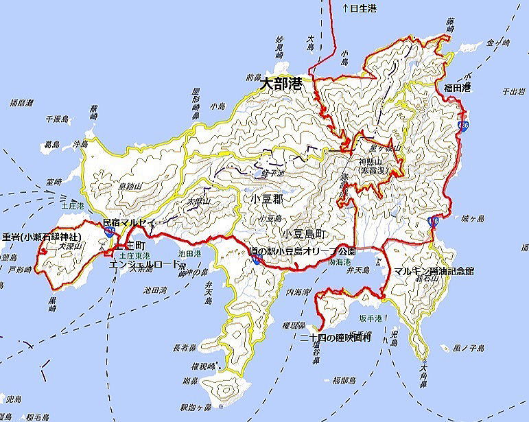 | 2日目(11月3日) 宿(民宿マルセイ) 8:30 出発 ↓ 重岩(小瀬石鎚神社) 8:40 到着 9:20出発 ↓ エンジェルロード 9:40 到着 10:20 出発 ↓ マルキン醤油記念館 10:50 到着 11:20 出発 ↓ 二十四の瞳映画村 11:30 到着 13:10 出発 ↓ 大部港(フェリー乗り場) 13:50 到着 14:20 フェリー出航 ↓ 日生港(フェリー乗り場) 15:30 到着 自宅に到着17:30 |