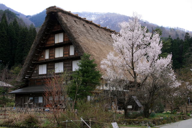 池に写った合掌作りと桜、バックは雪山のコントラストがすばらしいです。月末が桜が満開になり、観光客もいっぱい!!やはり私は静かに見物するほうが良いです。 |