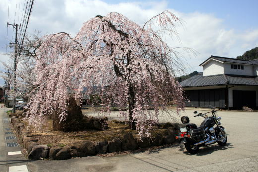 | 白川郷の合掌造り集落では1時間半ほど散策してから再出発です、東海北陸道の白川郷ICから飛騨清見ICまで約25kmは殆どがトンネルの中、一区間だけ走り飛騨清見道路で高山方面へ、国道158号線で高山市内方面へ国道41号線を少し走り、国道361号線へ入るときに道に迷ってしました。その時偶然満開の桜を見つけたのがこの写真です。 | ![]() |