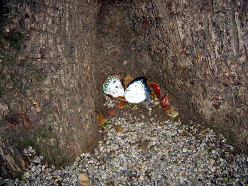 楠の大木の幹に置かれた石に描かれたヒョットコ・オカメ