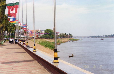 メコン川沿いの遊歩道 ガイド嬢と記念写真 カンボジアにライオンがいた?