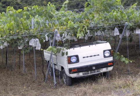 目的は右の写真のようにブドウの棚の下に入ったり、柿の樹の間に入ったりして作業の労力を減らすことです。普通の軽トラだと1.7mぐらいしか高さのない棚の下に入ることができません。そんなときこの軽トラが大活躍!!
