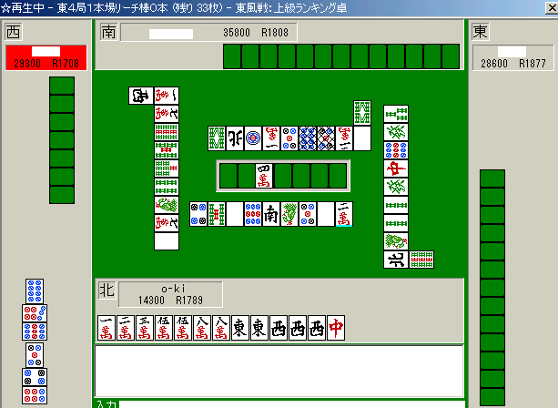 うまく西がアンコに東がトイツになりました。前順は染めがバレたくないので2マン速攻でツモ切りしました。・・で上家が西捨てた場面。