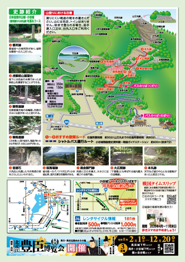 2026年04月10日 2026年5月2日(土)~6日(水) 上記の期間は小谷城シャトルバスが運行します。 期間中、小谷山林道はシャトルバス以外の車両は通行できません。 おもて ![]() 大きい画像で見る うら ![]() 大きい画像で見る 小谷城シャトルバスの運行に関してのお問い合わせ 【公益社団法人長浜米原観光協会】(TEL/0749-53-2650)まで