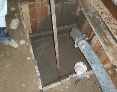 生コン投入バイブレーターでしっかり隅々に生コンを回します。投入完了上部をきれいにします。