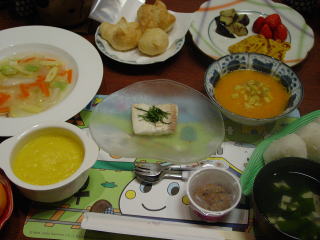 写真にはないけれど、かぼちゃを丸ごとゆでて、器にし、がほちゃのスープを作ってくださいました。