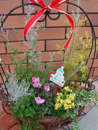 その時に写真真中・右のかごアレンジ、花を選ぶとこから、植え込みまで主人がやりました。