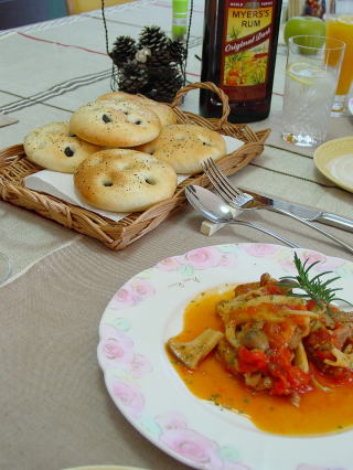今日のメニューは、フォカッチャ、豚ヘレ肉のトマト煮込み、レーズンパン、ゆず茶