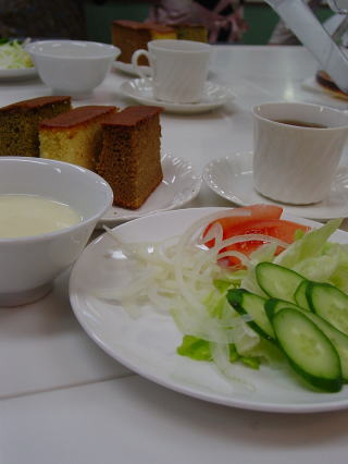 のカステラと、サラダと、さつまいものスープと紅茶をいただきました。