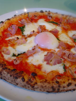 lunchは、お友達とピザをシェアーしました。「温泉卵とベーコンのピッツア」「アラビアータ」