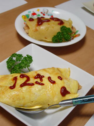 オムライスもケチャップでおめかし。奥のは、アレルギー次男用に卵の薄焼きもどき=