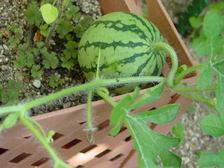 下のすいかは、今、うちの庭で育っている最中のちびすいか!