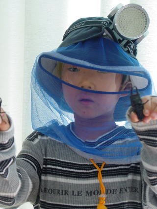 写真のように親子で、蚊よけの網の帽子をかぶり、頭にライトをつけ、