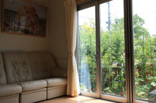 リビングから見た庭、景色マークで撮影、なんか暗いやん!!