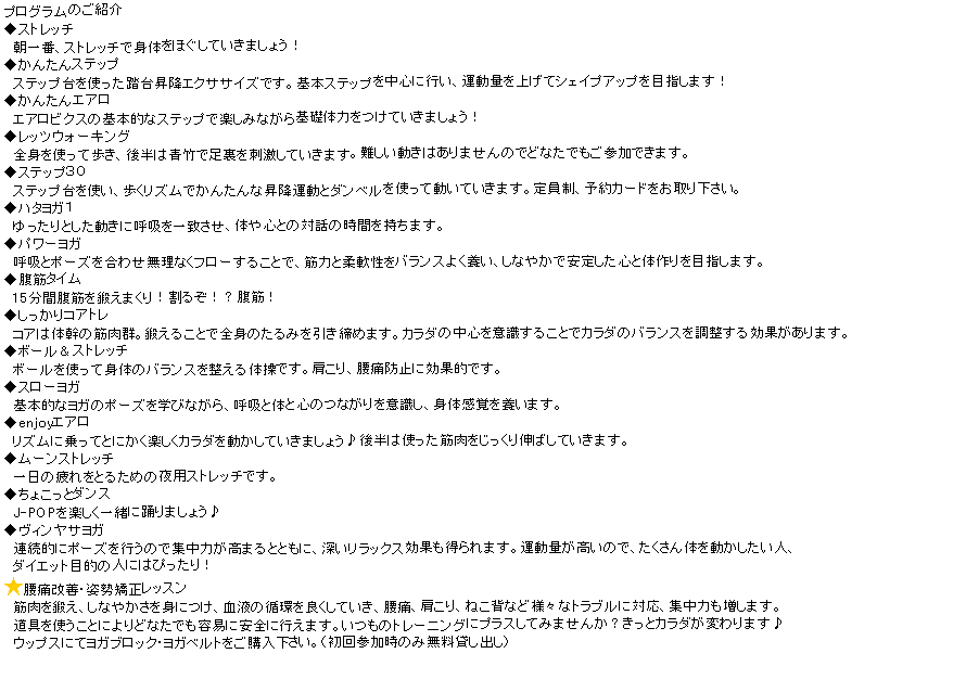 | かんたんエアロ | (有料レッスン) | 腰痛改善姿勢矯正 | |||||