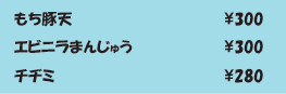 若鶏のから揚げイメージもち豚天 ¥300・エビニラまんじゅう ¥300・チヂミ ¥280若鶏のから揚げ ¥300・鉄鍋チャーシュー ¥500・チャプチェ ¥580